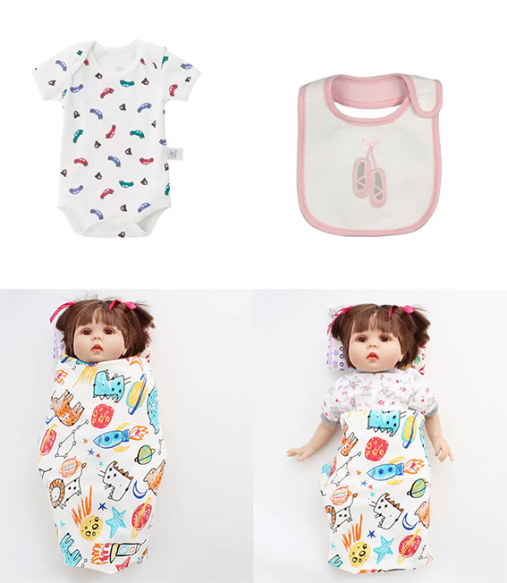 Baby outfit, baby pajama, baby burping cloth, baby swaddle blanket, diaper, etc.